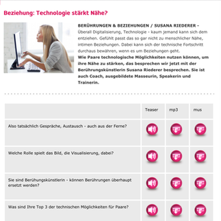 Wie Paare technologische Möglichkeiten nutzen können, um ihre Nähe zu stärken, das besprechen wir jetzt mit der Berührungskünstlerin Susana Riederer besprechen. Sie ist auch Coach, ausgebildete Masseurin, Speakerin und Trainerin.
